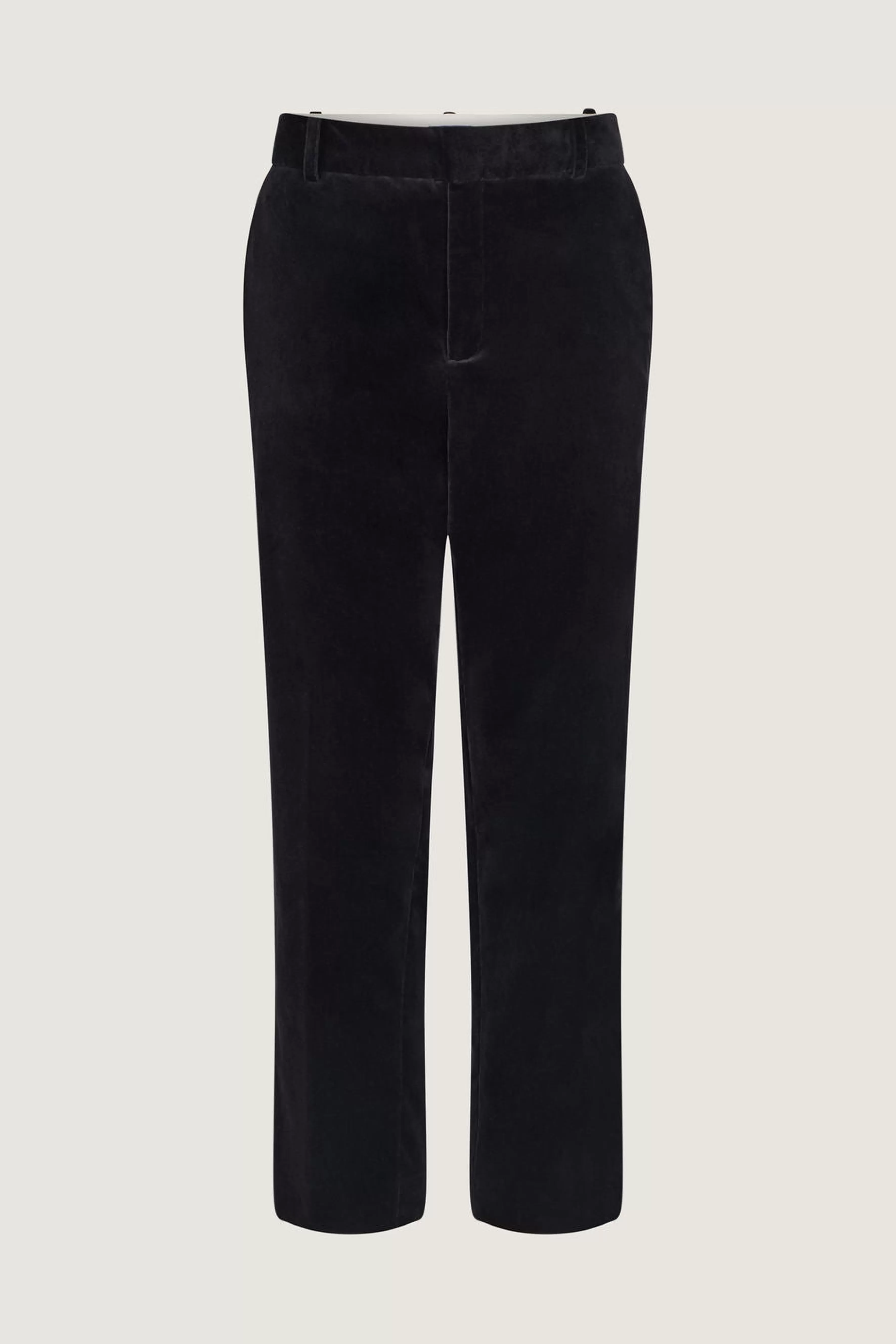 Pantalon en velours lisse – Pantalon cigarette droit– Pli marqué le long de la jambe– Deux poches italiennes devant– Une poche passepoilée au dos