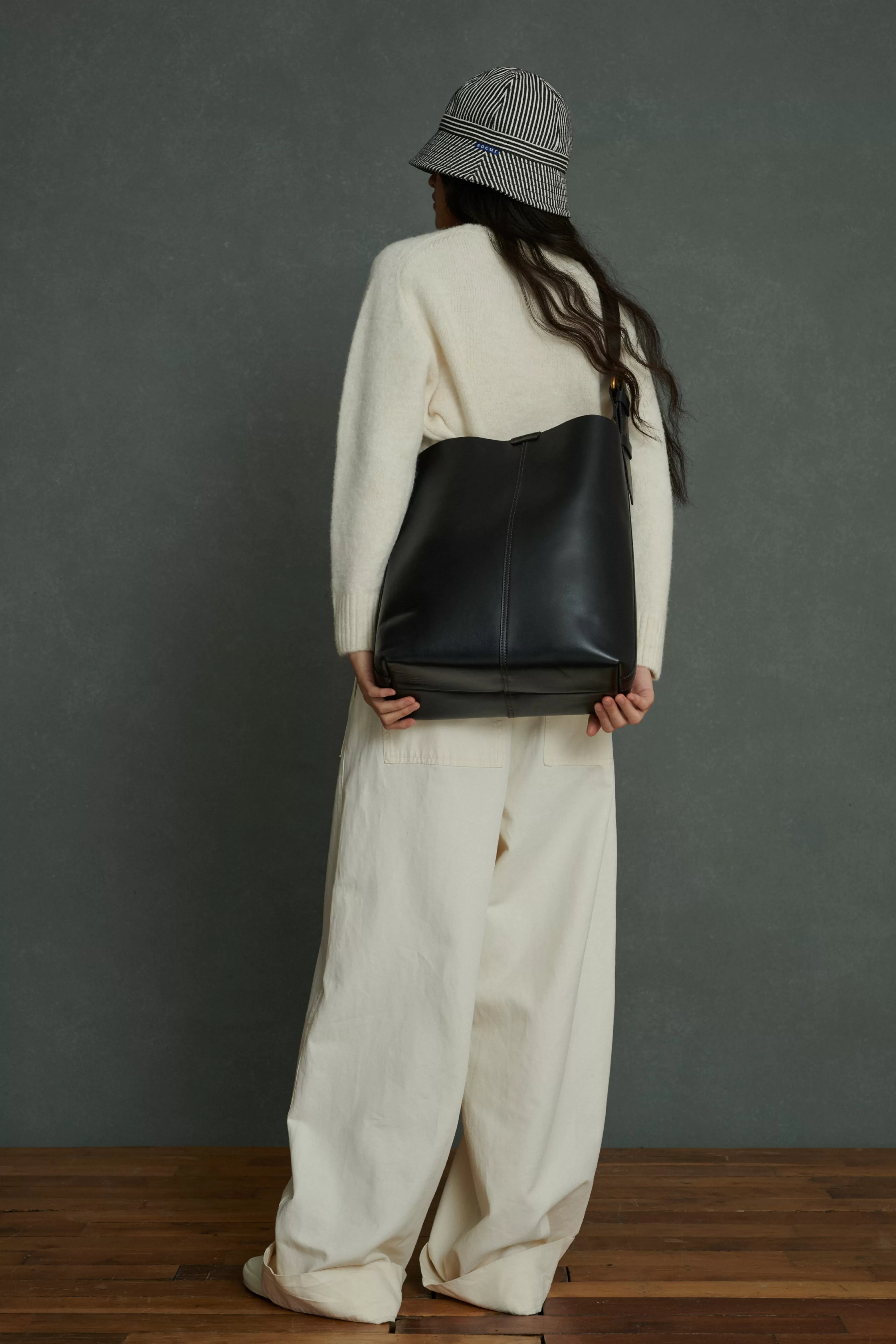 Sac seau oversize en cuir bicolore, extérieur noir et intérieur cognac