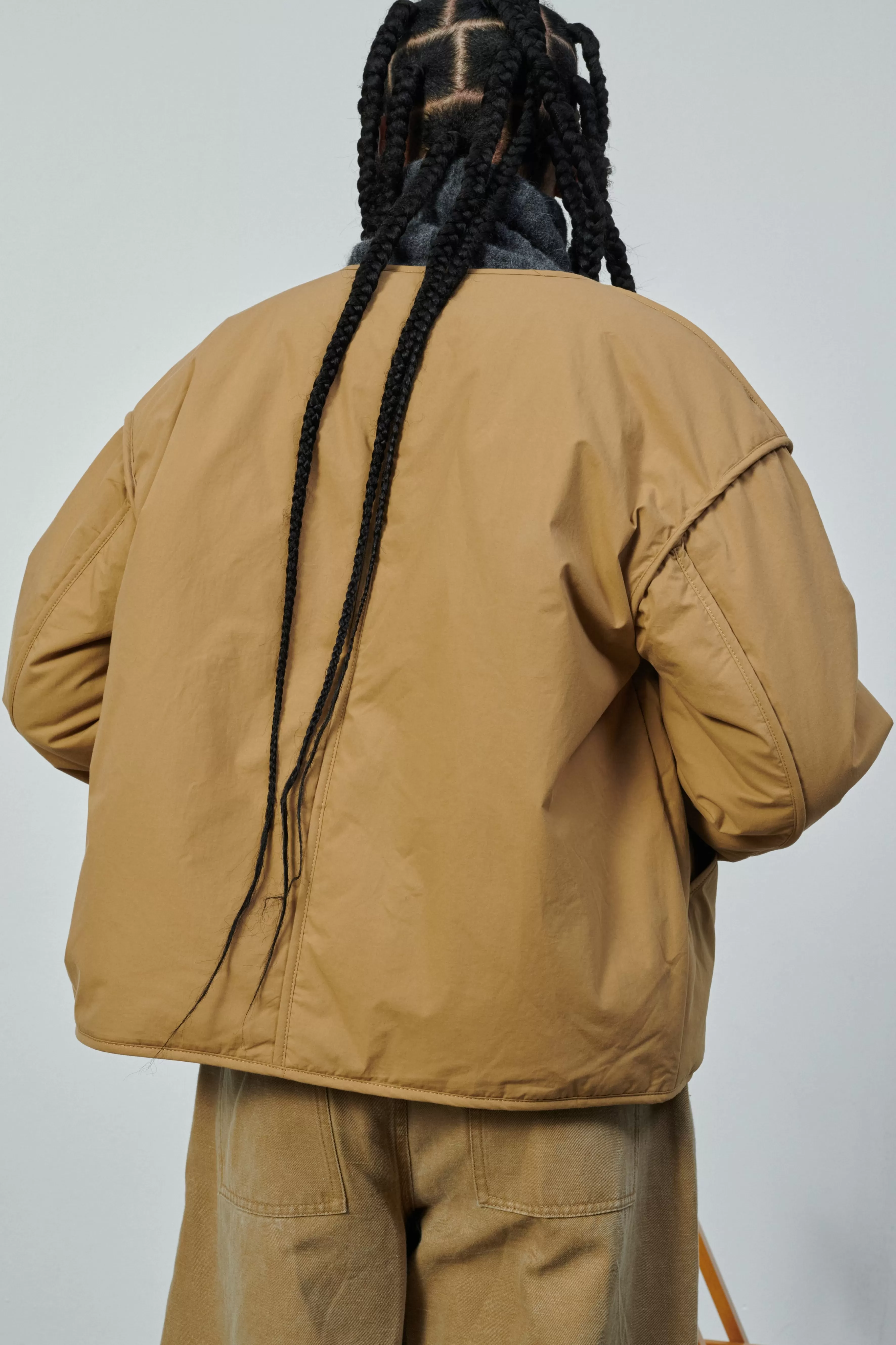 Doudoune en coton emerisé – Coupe ample et ronde, rembourrage léger– Fermeture à boutons pressions– Encolure ronde– Poches passepoilées