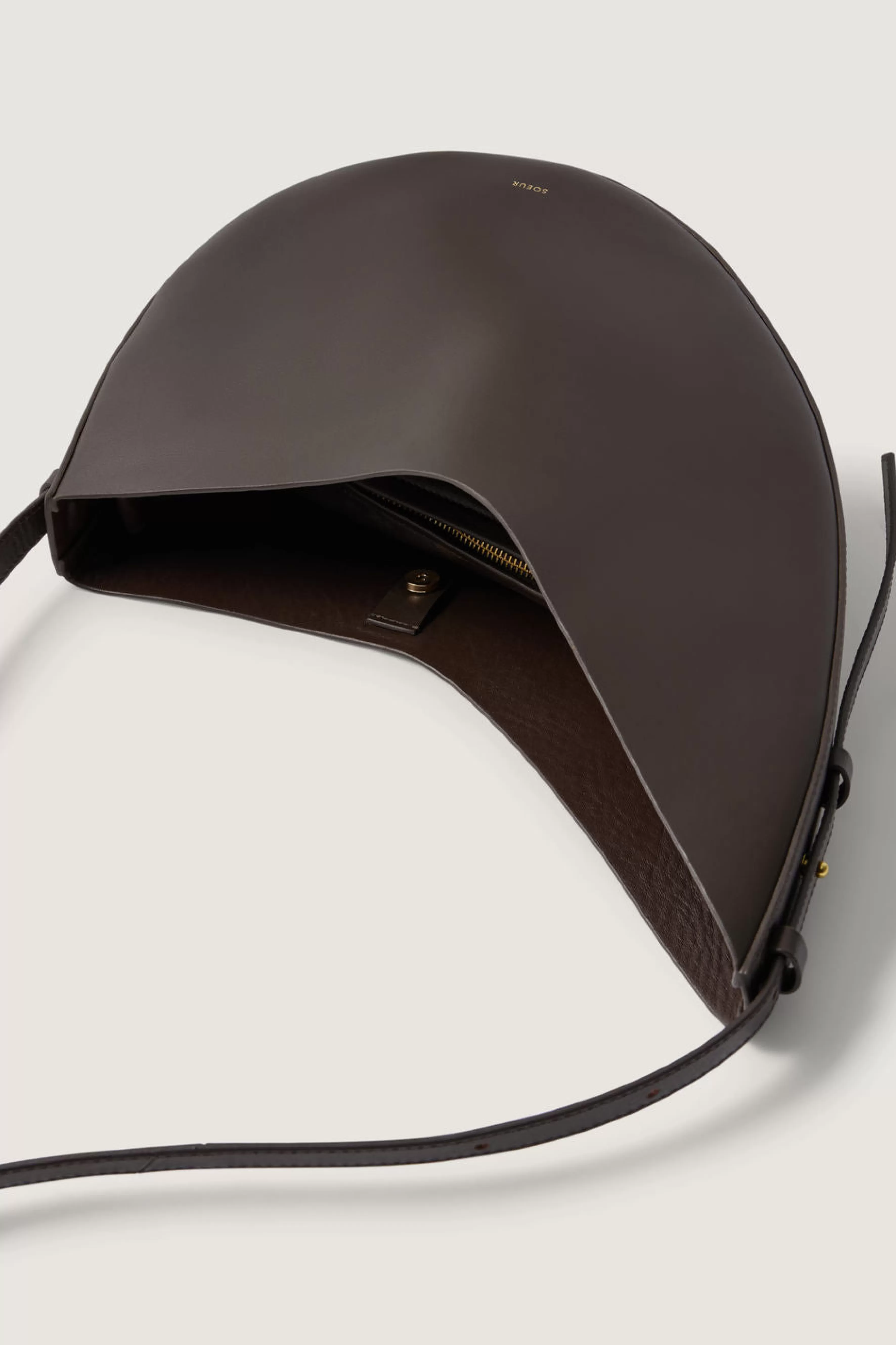 Sac en cuir lisse charbon – Forme arrondie asymétrique– Bandoulière en cuir ajustable avec boutons de col– Sac porté épaule– Pochon en cuir d’agneau amovible à l’intérieur du sac et fixé par un bouton-pression– Hauteur (maximale) 38cm, Largeur 31cm, profondeur 4cm– Métallerie dorée– Doublure cuir d’agneau– Cuir LWG