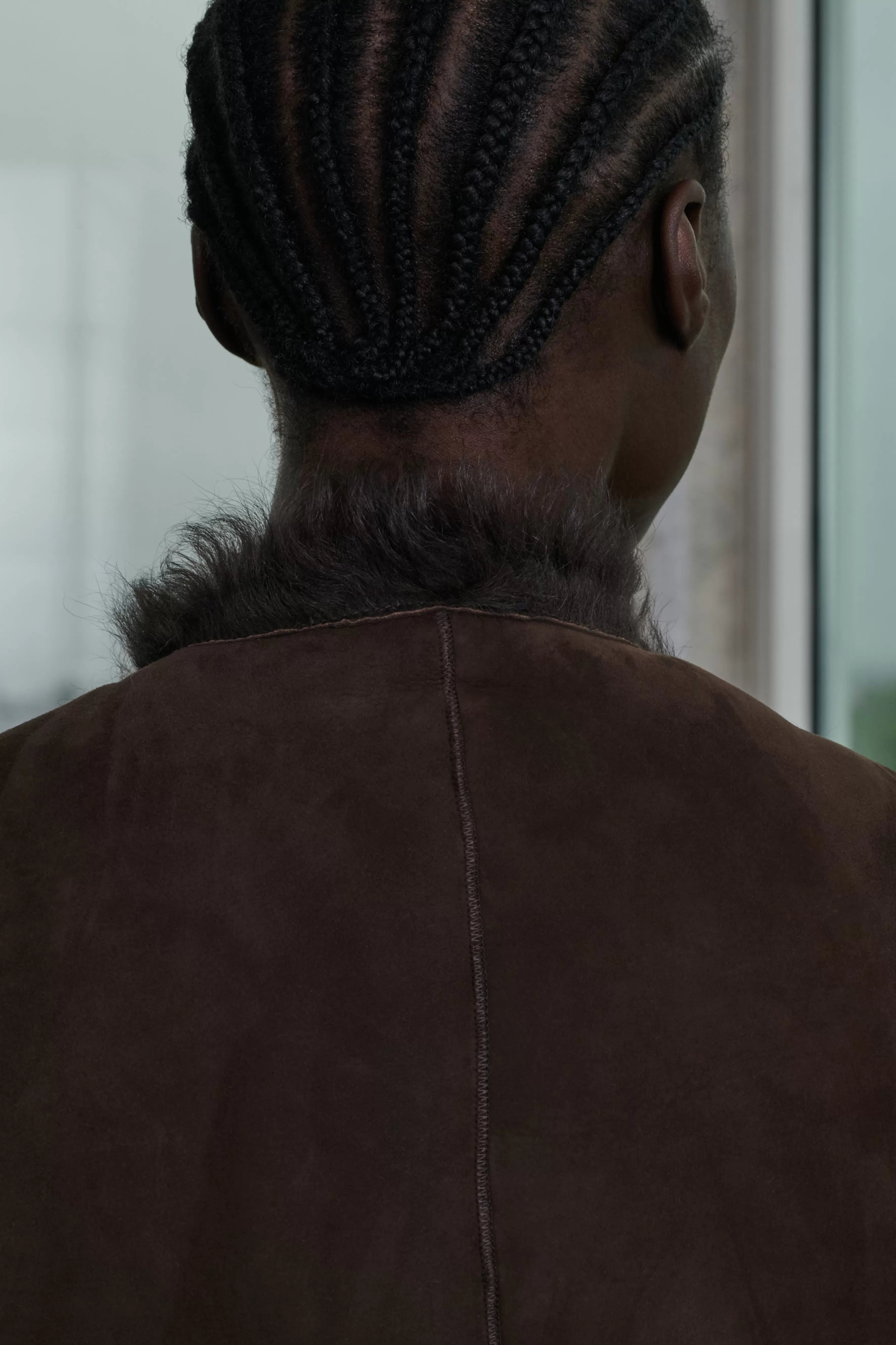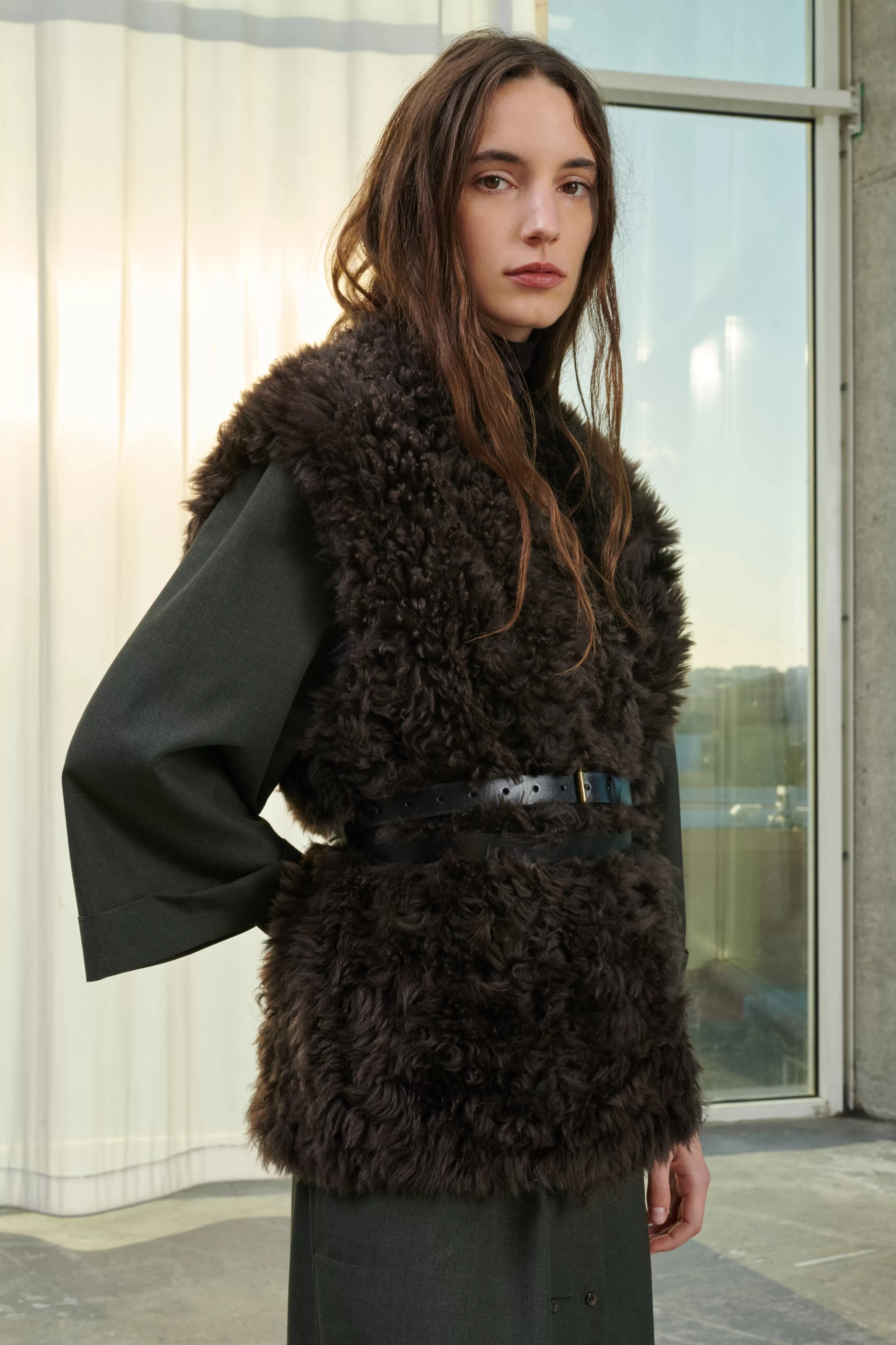 Gilet en peau lainée réversible bouclettes naturelles – Coupe droite en cache- coeur – Ouverture boutonnée– Poches cachées dans la découpe de taille– Éviter la pluie. Prendre conseils auprès d’un spécialiste pour imperméabiliser.
