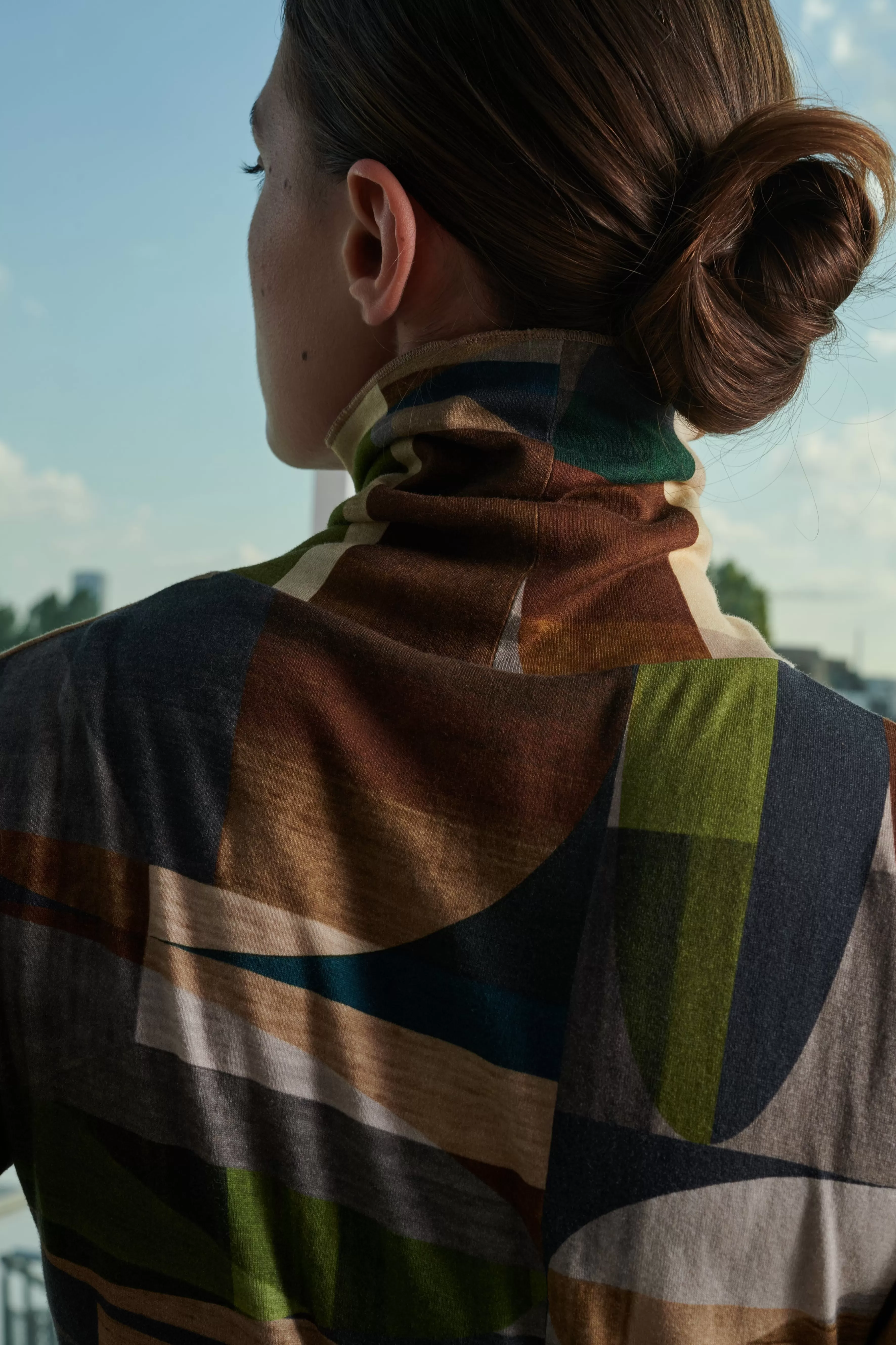 Haut à col montant, à côtes imprimé – Coupe droite près du corps– Côtes fines et stretch– Col montant à roulotter– Manches longues– Finitions en surjet au bas de manches, bas de corps et col