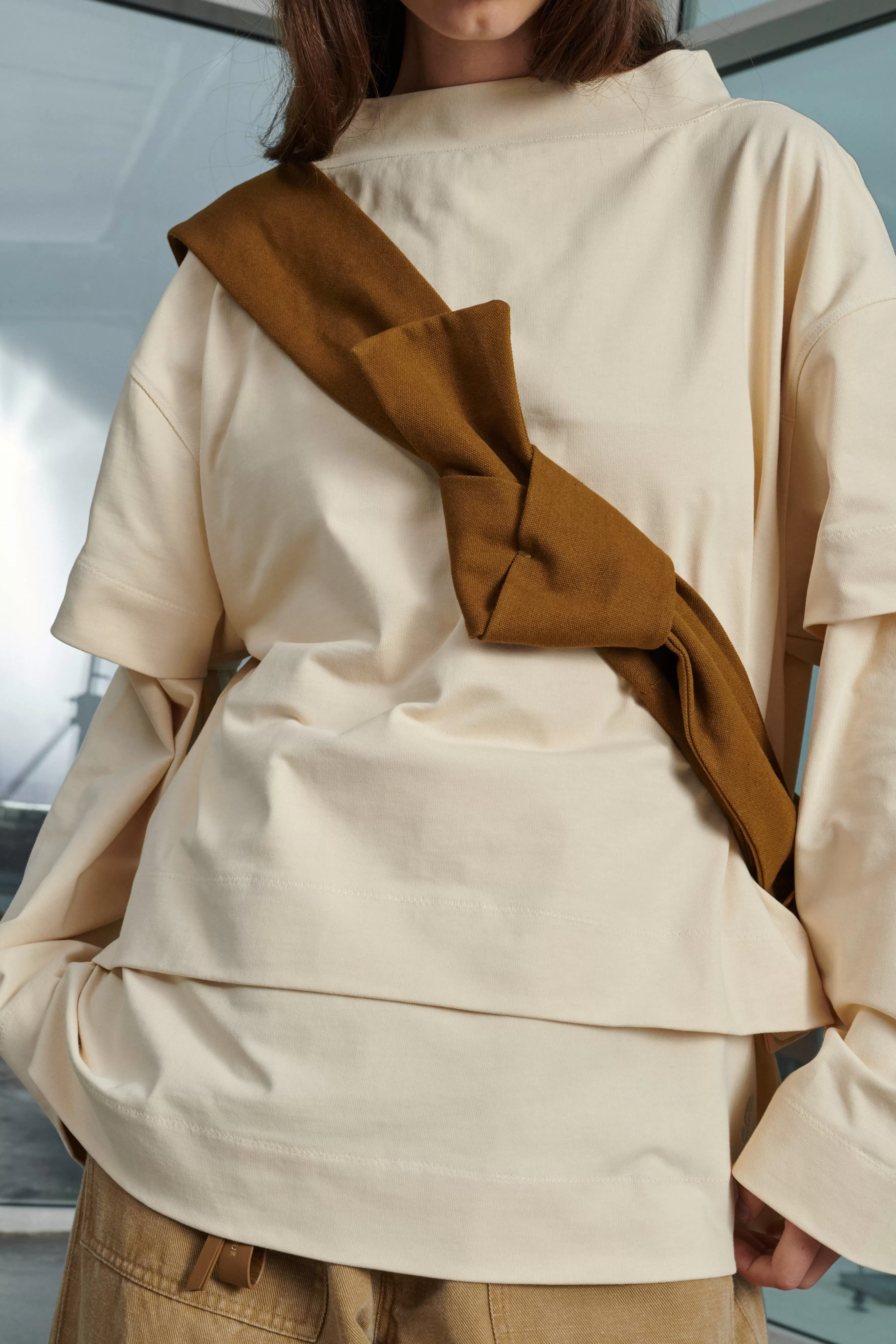 Banane en canvas déperlant bronze – Large sangle en canvas ajustable par un n艙ud coulissant– Porté latéral ou dans le dos– Poche extérieur zippée– Fermeture zippée – Métallerie dorée– Doublure en coton – Hauteur 25cm, longueur 43,5cm