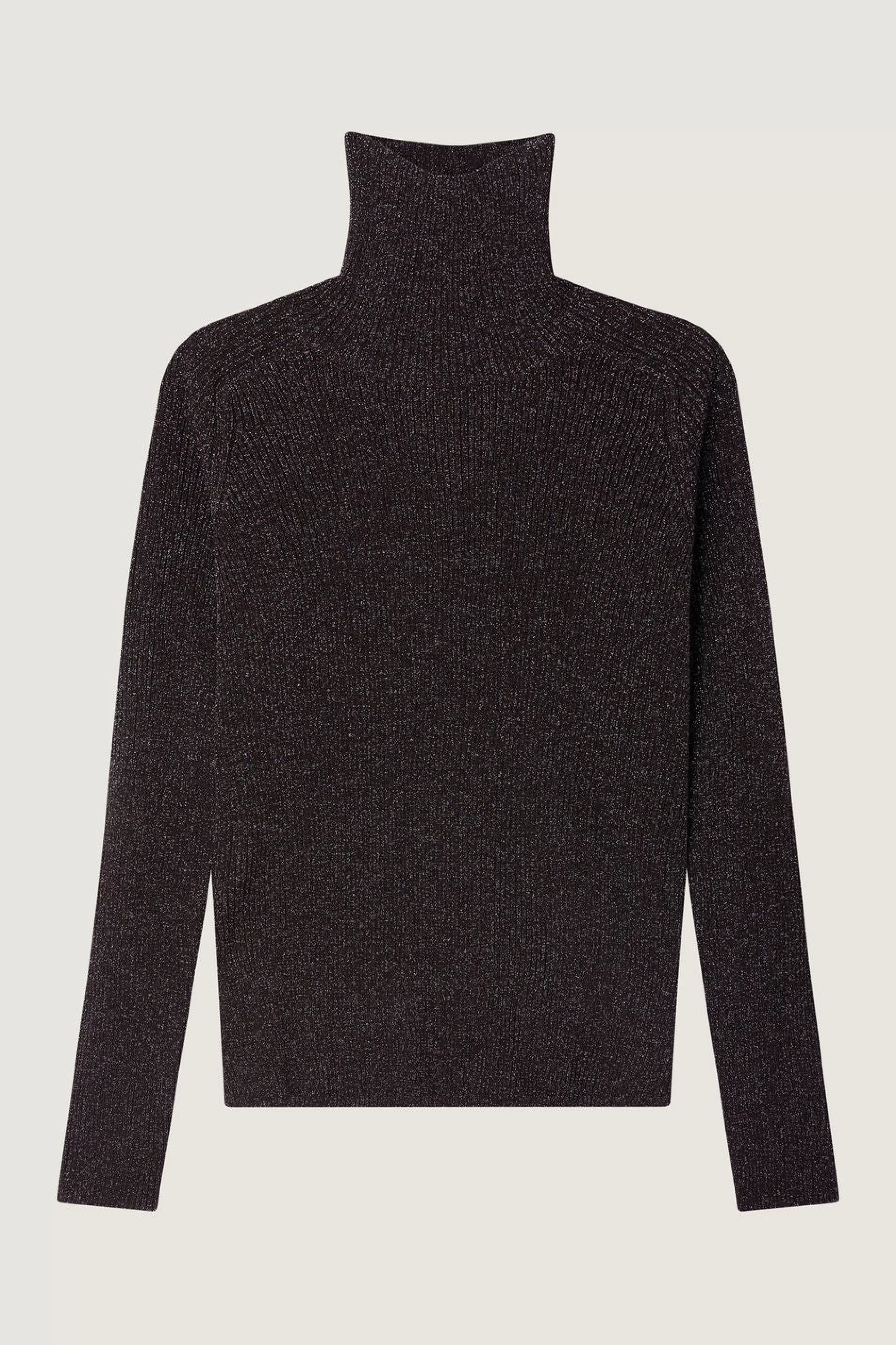 Pull col montant en lurex– Coupe droite, près du corps– Manches longues– Col montant– Fentes en bas de corps, des deux côtés– Tricotage en côtes– Maille jauge moyenne extensible